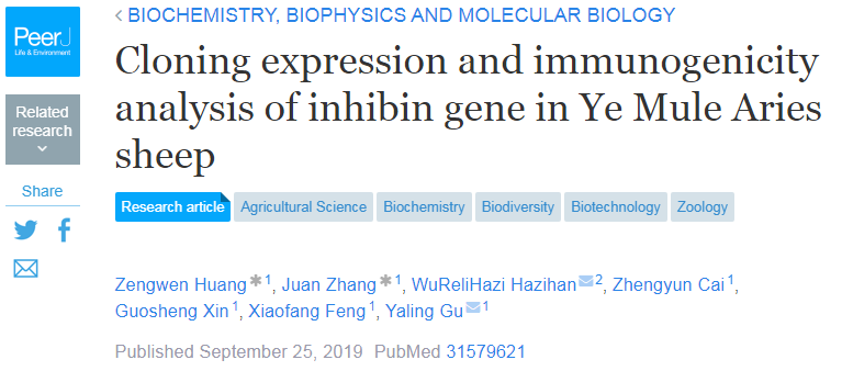 近日,畜牧学科顾亚玲教授团队黄增文博士,在《PeerJ》杂志发表了题为“Cloning expression and immunogenicity analysis ofinhibin gene in Ye Mule Aries sheep”的研究论文。黄增文博士和张娟副教授为本论文的共同第一作者,顾亚玲教授为本论文通讯作者。其研究成果阐明了卵泡抑制素基因(INHα)疫苗对家兔FSH分泌的调控机理。