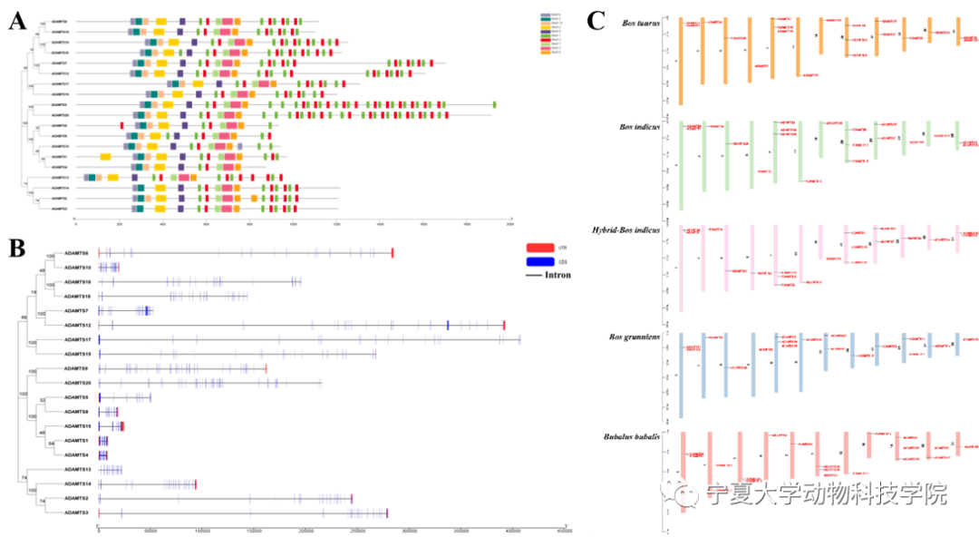 目前,关于牛ADAMTS基因家族的全基因组鉴定和分析尚未开展。此外,ADAMTS基因参与包括关节炎、子宫内膜炎、自身免疫性脑脊髓炎、呼吸道炎症的调节,特别是几个家族成员已被确定为相关炎症的治疗靶点,但它们在牛乳房炎和乳腺上皮细胞炎症反应中的表达模式和作用尚未被报道。马云教授科研团队认为确定ADAMTS基因家族的系统发育关系是阐明该基因家族进化和功能的重要工作。因此,团队基于全基因组生物信息学分析,在牛中鉴定到了19个ADAMTS家族基因,它们不均匀的分布在12条染色体上。系统发育分析表明,牛的ADAMTS分为8个亚家族,同一亚家族的基因结构和基序高度一致。共线性分析表明,牛的ADAMTS基因家族与其他牛亚科物种同源,许多ADAMTS基因可能来源于串联复制和分段复制。此外,基于RNA-seq数据的分析,该研究发现了ADAMTS基因在不同组织中表达模式。同时,还利用RT-qPCR分析了ADAMTS基因在LPS刺激牛乳腺上皮细胞炎症反应中的表达谱。这些研究结果可以为了解牛种属中ADAMTS基因的进化关系和表达模式提供思路,为阐明ADAMTS在炎症反应中的功能提供理论依据。