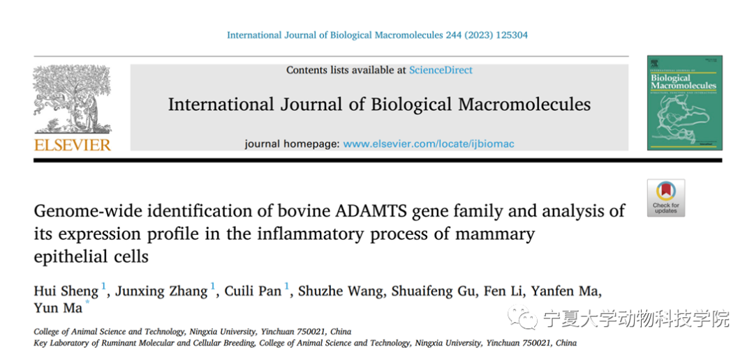马云教授领衔的宁夏优势特色牛产业科技创新团队在国际知名学术期刊《International Journal of Biological Macromolecules》(IF=8.2,中科院1区top)发表题为“Genome-wide identification of bovine ADAMTS gene family and analysis of its expression profile in the inflammatory process of mammary epithelial cells”的研究论文。