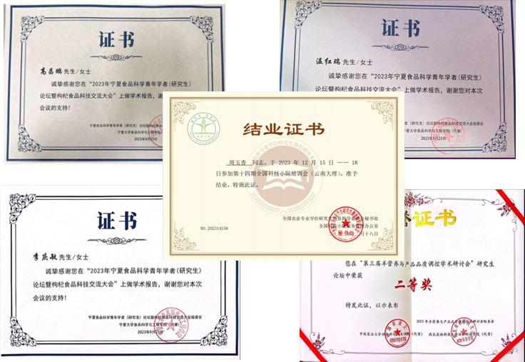 除此之外,2023年度领头羊学员也积极参加各种学术会议以及培训会与各位同行进行交流,如2023 年宁夏食品科学青年学者(研究生)论坛暨枸杞食品科技交流大会、第三届羊营养与产品品质调控学术研讨会、宁夏农技协科技小院建设工作培训班和全国科技小院培训会(云南大理)等,不断获取前沿知识,培养领头羊学员的创新意识以及实践、交流等能力,为羊业培养人才。