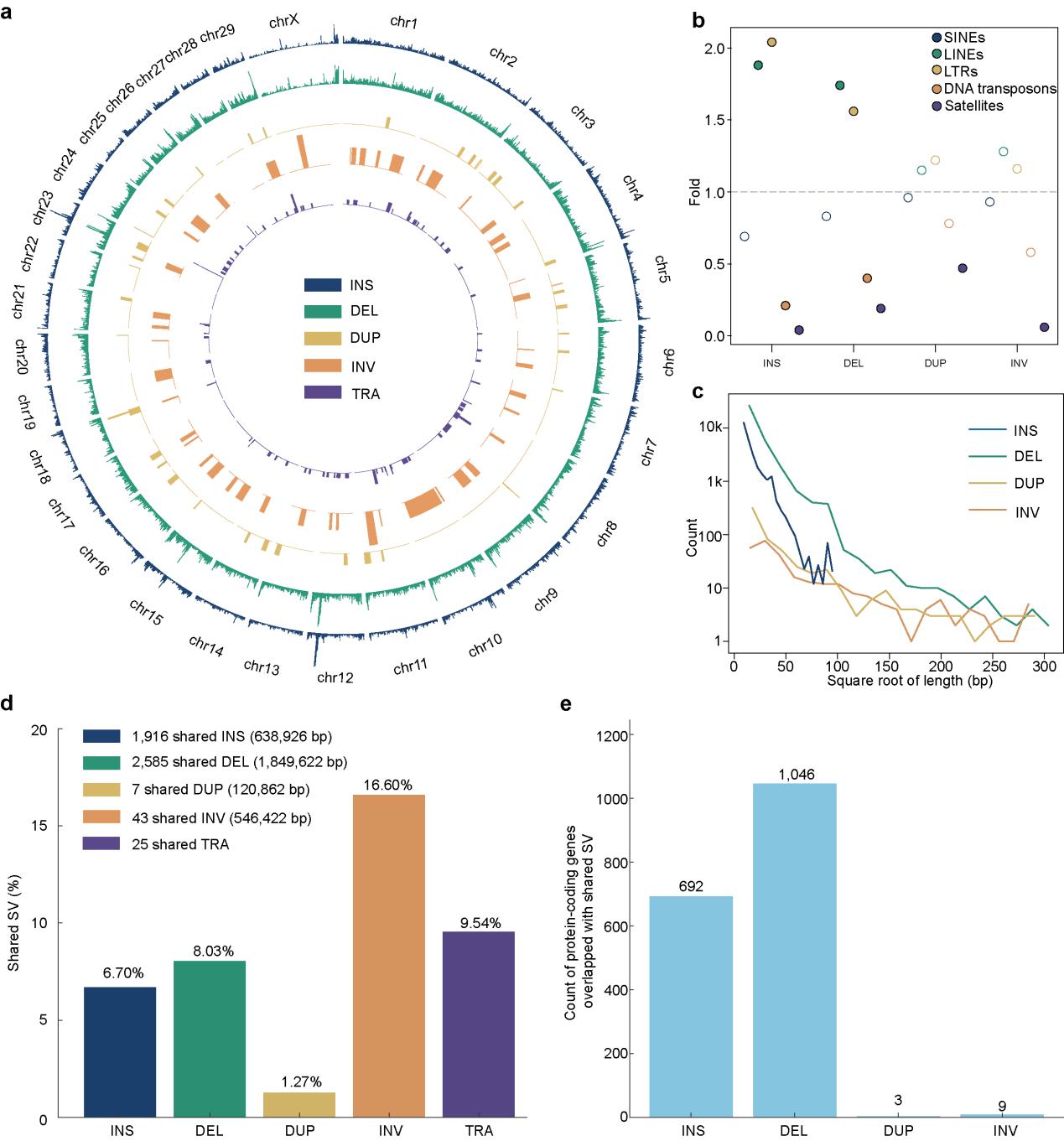 为捕捉可能影响固原黄牛性状的“大片段”遗传变异,研究团队进一步对来自同一区域的10头固原黄牛公牛开展Oxford Nanopore全基因组测序。通过长读长技术,共检测到65,273个结构变异(SV),累计长度达40.37Mb;其中有4,849个结构变异在10头牛中共享,总长度达3.15Mb。基于这些共享SV,研究团队重点筛选并可视化验证了一个位于IGF2BP2基因第二内含子的1,290bp缺失突变,相较国际参考基因组ARS-UCD1.2在固原黄牛中表现出一致性。该缺失位点与代谢调控密切相关,为解析固原黄牛适应性与生产性状的遗传基础提供了重要线索。