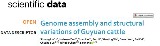 台湾三级片 马云教授团队联合西北农林科技大学台湾三级片 雷初朝教授/陈宁博副教授团队在Nature子刊《Scientific Data》(IF=6.9,5年IF=8.7)发表题为“Genome assembly and structural variations of Guyuan cattle”的研究论文。已毕业博士研究生刘爽(台湾三级片 /宁夏师范大学)、硕士研究生阎卉萱(西北农林科技大学)、博士研究生刘源(台湾三级片 )为本文共同第一作者。