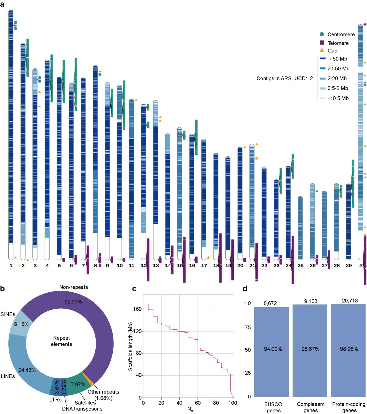 研究团队首先采集固原市35.34°N、105.28°E的一头成年固原黄牛公牛颈静脉血,用CTAB-QIAGEN法提取超高分子量DNA;随后利用PacBio Sequel II平台HiFi模式产出91.15 Gb读长(QV 70.99,准确率>99.99%),结合hifiasm+RagTag流程,将725条contig(contig N50 85.27 Mb)锚定到30条染色体,得到2.86 Gb无冗余组装Guyuan_Btau_1.0,其中16条染色体实现“零缺口”。BUSCO评估显示单拷贝同源基因完整度94.00%,Compleasm达98.67%,蛋白编码基因成功迁移98.96%,重复序列占比47.09%。