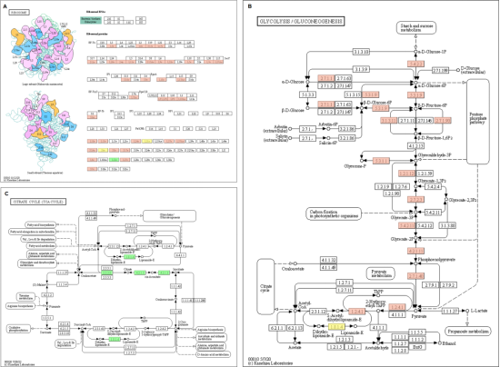 Figure 2 The KEGG enrichment results of the significantly up-regulated proteins when compared with USO to SMG. A: map03010 Ribosome, B:map00010 Glycolysis /Gluconeogenesis, C: map00020 Citrate cycle (TCA cycle). In the figure, red indicates differentially up-regulated proteins; green indicates differentially down-regulated proteins; yellow indicates that there are multiple proteins in this node, including differentially up-regulated and differentially down-regulated proteins.