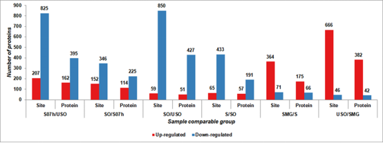 Figure 1.Distribution maps of differential modification sites and protein numbers in different comparison groups. USO: unsporulated oocysts, SO 7h: sporulated 7 h oocysts, SO: sporulated oocysts, S: sporozoites, SMG: the second generation merozoites.